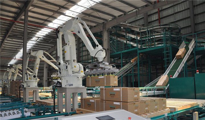 (四)自動化下線機:通過機器人完成自動夾取產品、自動堆碼、自動取夾板等操作,全過程無人化操作,可滿足產品質量在150KG內的自動堆垛,安定效率高。