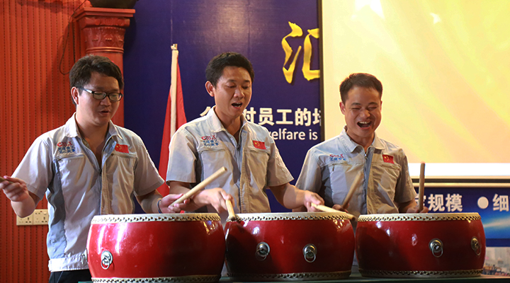隨后,東莞分公司廠(chǎng)長(zhǎng)歐陽(yáng)輝鳳、智能裝備研發(fā)中心工程師鐘揚(yáng)、裝配測(cè)試技術(shù)員劉洋「三陽(yáng)開(kāi)泰」共同敲響士氣鼓、鼓舞匯興智造奮勇前進(jìn)。