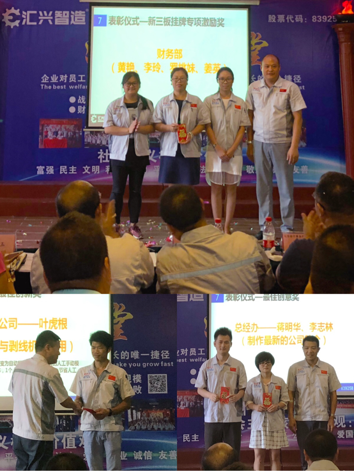 隨后舉行新員工入職歡迎儀式,每個月份都會有各個領域的人才加入匯興智造這個大家庭,企業的快速發展需要更多的人才輸入,堅信在匯興智造,定能營造愈加廣闊的舞臺,各位新老員工在這里都能遇見最美麗的自己。同時對公司有重大貢獻的各位同事進行頒獎儀式,包括新三板掛牌專項激勵獎、最佳創新獎、好點子獎、新聞撰寫獎、人才推薦獎、最佳創意獎。