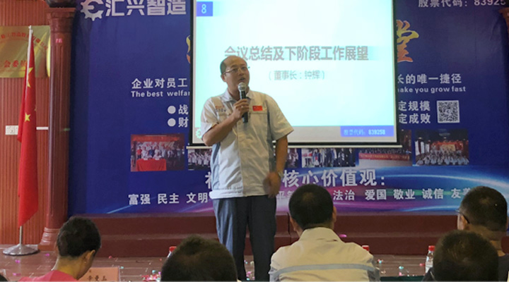最后,由鐘輝董事長作會議總結及下階段工作展望。董事長鐘輝表示:“陪伴才是最長情的告白”感謝各位同事及貴賓對匯興智造一如既往的支持。企業的發展離不開每一位的努力,未來匯興智造將快速發展的階段。沿著老路去不了新的地方,正如我們會議場上唱響的歌曲,相信我們創造奇跡。會議取得圓滿成功,集眾智,匯眾力,搶時間,抓機遇,全體匯興人,一諾千金,奮斗到底!