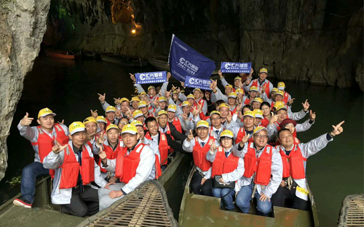 旅途第三站:洞天仙境。洞口有一巨大的鐘乳石向下垂吊,從巖洞口乘船而入,在眾多奇姿怪態的鐘乳間穿掠。穿過一段狹窄的地方進入到洞內,視野豁然開朗,有綠樹、蔓草、野花,抬頭仰望,洞中有天,洞天相連,讓人嘆為觀止?!皦粝胫谩钡膱F隊成員們在感嘆大自然的神奇時,也表示天外有天,人外有人,只有不斷前行,才有更廣闊的天地。邊走邊看,邊看邊想,“夢想之旅”讓匯興智造的骨干們看得更遠,想得更深,真是不虛此行。