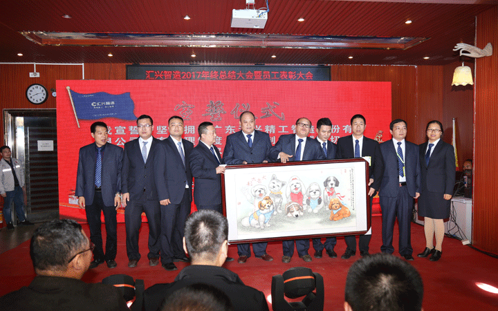 晚會現場,匯興智造董事會、監事會成員登臺舉行宣誓儀式,為2018沖鋒表決心、擂戰鼓,確保公司在2020年前實現效率倍增、業績倍增、效益倍增,成功登陸創業板。儀式結束后,宣誓成員們圍繞在梁培浩教授贈送的畫作《大吉大利》周圍,借用畫上8只憨態可掬的小狗送出“旺狗賀歲、歡樂祥瑞”的祝福。8,既代表2018,也代表“發”,祝福匯興智造在2018大發展,創新高。