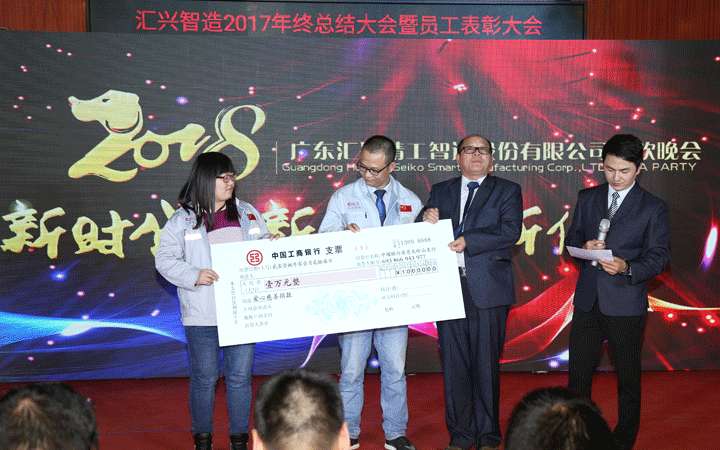 2017年,匯興智造設立了愛心慈善基金會,為家庭生活異常困難的員工及其家屬奉獻愛心。在晚會現場,家庭遇到極大困難的五名員工接受了愛心捐贈。只要人人都獻出一點愛,世界將變成美好的人間。在場的所有人無不被這一善舉感動拭淚。
