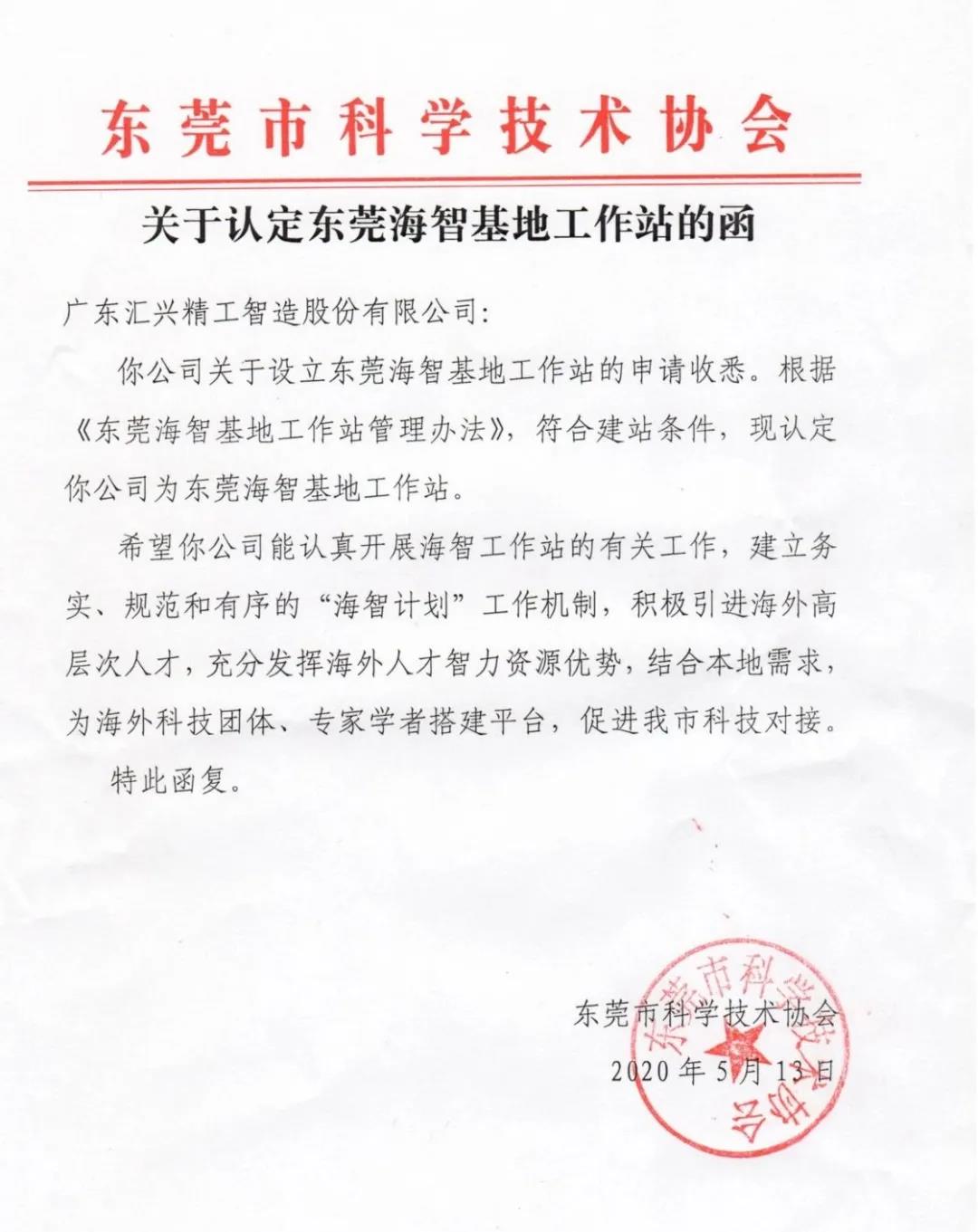 近日,東莞市科技協(xié)會(huì)公布了2020年度東莞海智基地工作站認(rèn)定函,廣東匯興精工智造股份有限公司(簡(jiǎn)稱:匯興智造)成功獲批!