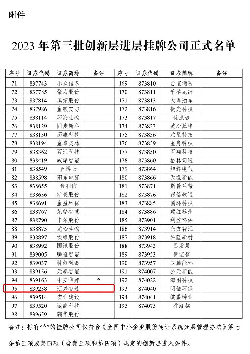 全國中小企業(yè)股份轉(zhuǎn)讓系統(tǒng)有限責任公司于2023年5月17日在其官網(wǎng)發(fā)布的《關于2023年第三批創(chuàng)新層進層決定的公告》(股轉(zhuǎn)公告【2023】 200 號),廣東匯興精工智造股份有限公司(股票代碼:839258)憑借持續(xù)增長的經(jīng)營業(yè)績從眾多基礎層掛牌公司中脫穎而出,2023年5月19日正式進入新三板創(chuàng)新層,邁向更高層次的資本舞臺。